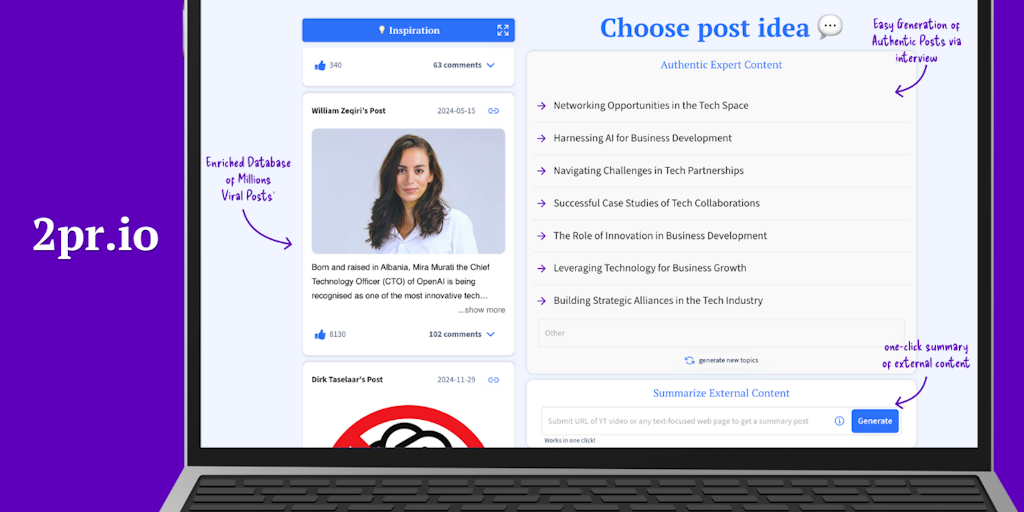 2PR is the ultimate AI Agent & Toolkit. It covers the entire LinkedIn content cycle: • Strategy & AI profile review to clarify your positioning • Smart post ideas sourced from viral LinkedIn data and