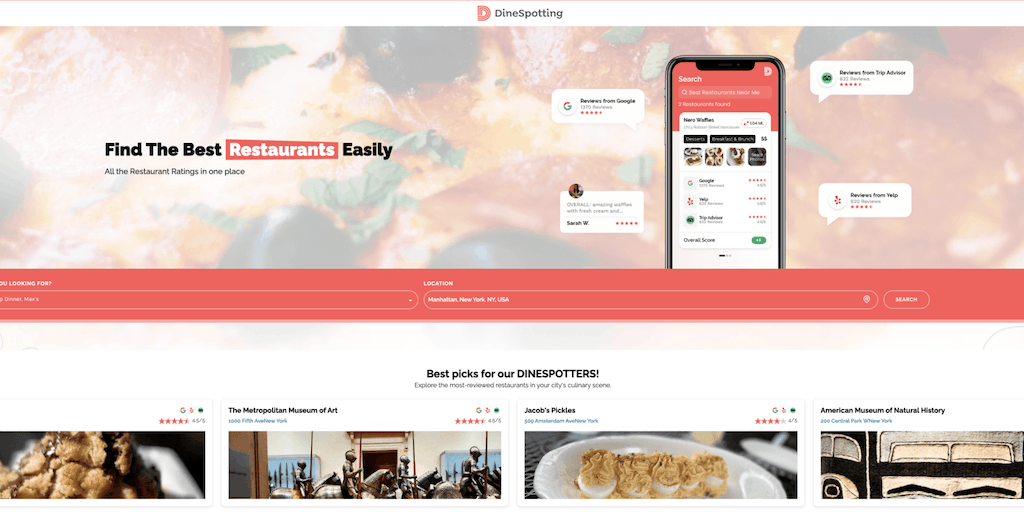 Dinespotting makes it easy to find the best restaurants near you by aggregating ratings from multiple sites into one place! Think the ratings of Yelp, Google, and Tripadvisor in one place.