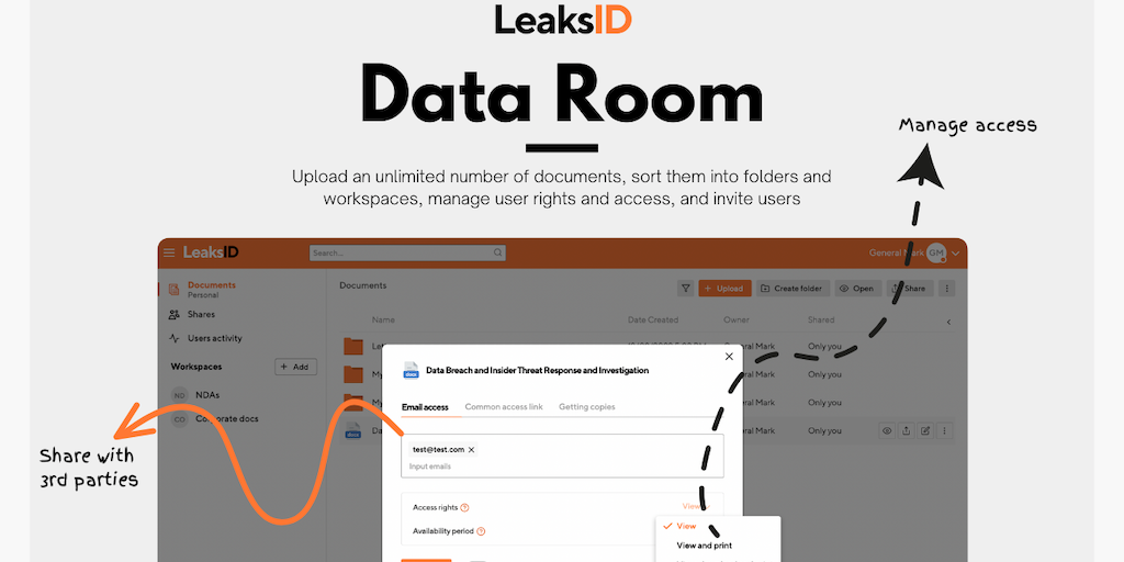 Use LeaksID Data Room for comprehensive preparation of documents before due diligence. Share confidential documents with 3rd parties in a controlled way. Manage access to protected files, sort them in