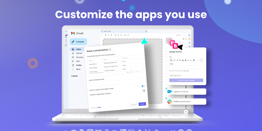 Supercharge your team by building internal features into the apps you already use, without code. Create your own add-ons, command bar tools, or notifications. Works with Gmail, Airtable, Zendesk, HubS