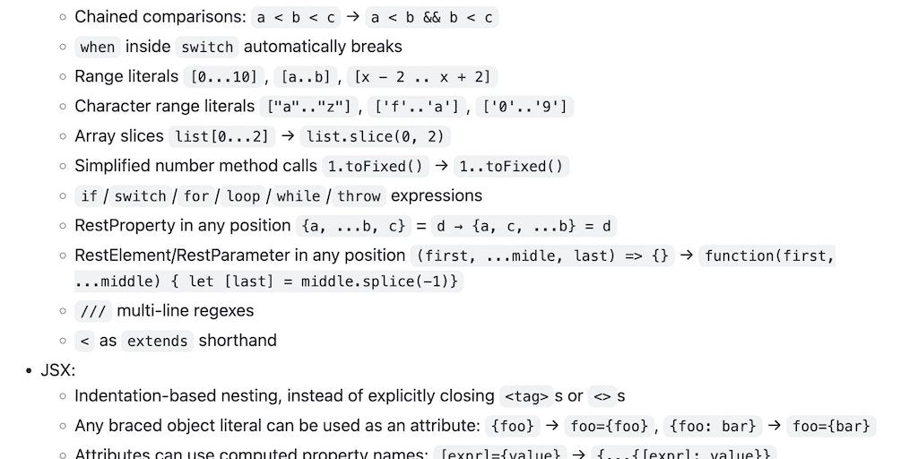 Civet is a new programming language that compiles to TypeScript. It's 99% compatible with existing TypeScript but provides additional syntax to simplify common patterns. There's a lot of enhanced JSX
