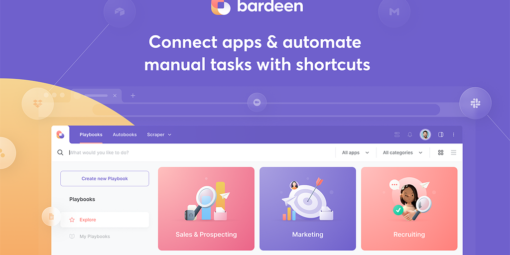 Bardeen is an automation app to replace your repetitive tasks with a single shortcut and control your webapps from anywhere. Explore our integrations with your favorite apps and hundreds of pre-built