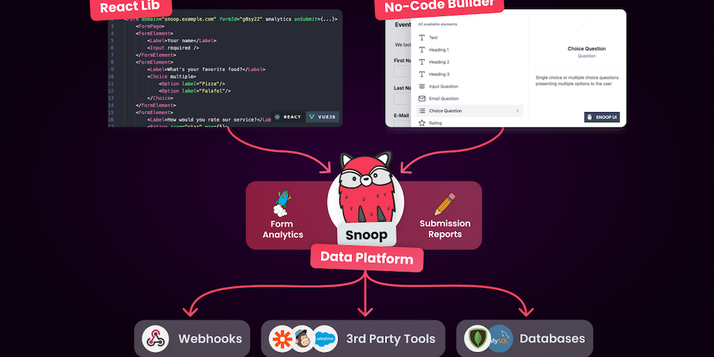 snoopForms is full-stack open-source form solution: Use a No-Code editor or a React Lib to create forms rapidly. Pipe your submissions to one central data hub to manage and forward the data where you