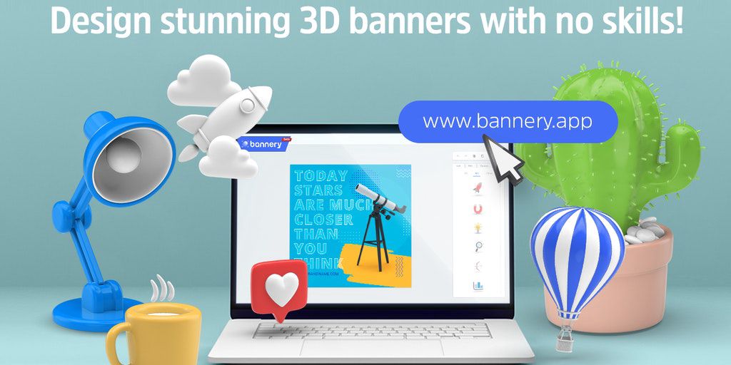 Bannery is an online graphics creator for composing stunning banners with 3D objects. Use our templates, built-in library or order custom 3D models to create beautiful and effective banners, flyers, a