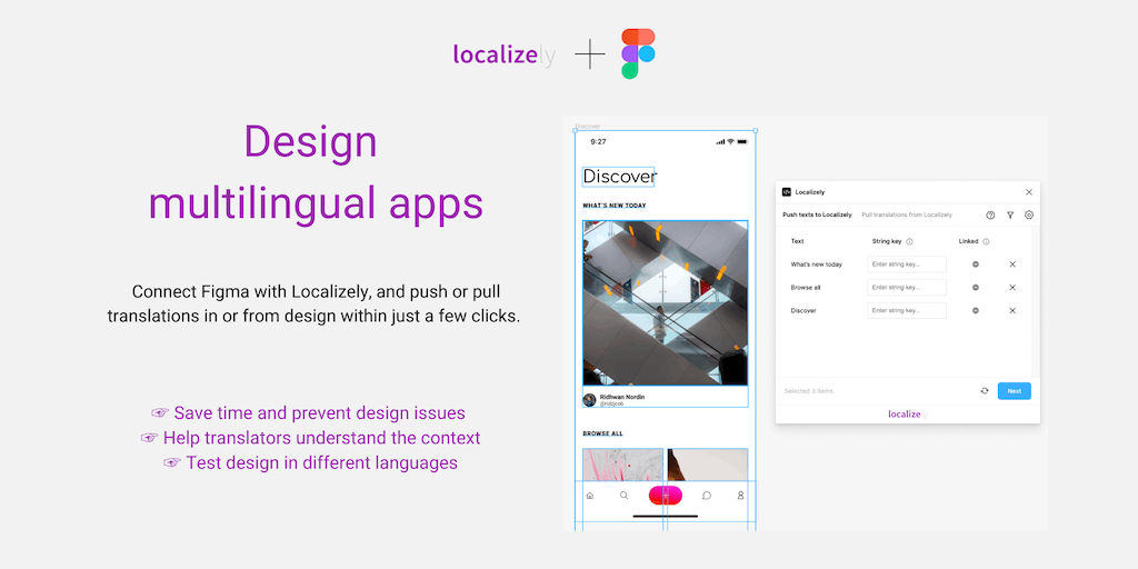 Speed up your multilingual software development by making your design localization-ready from the start, with our Figma plugin. Easily send your design texts from Figma to Localizely, get them transla