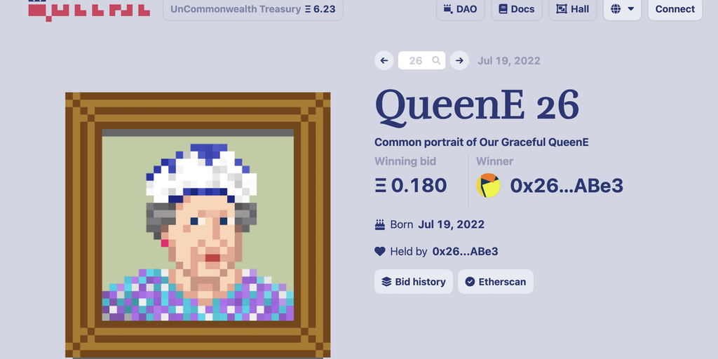 QueenE DAO generates a new NFT portrait of the Queen Elizabeth everyday. The NFT is in auction for 24 hours, all the funds go to a treasury managed by the DAO. The project was inspired by Nouns, but i