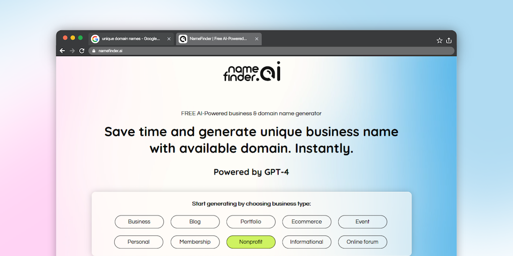 Namefinder.ai - Free GPT-4 powered business & domain name generator | Product Hunt