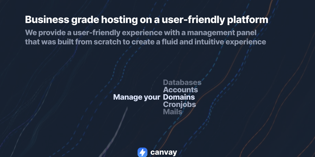 canvay.io is a powerful and easy-to-use webhosting platform for deploying your PHP-based or static sites. We provide a user friendly experience with a management panel that was built from scratch to c
