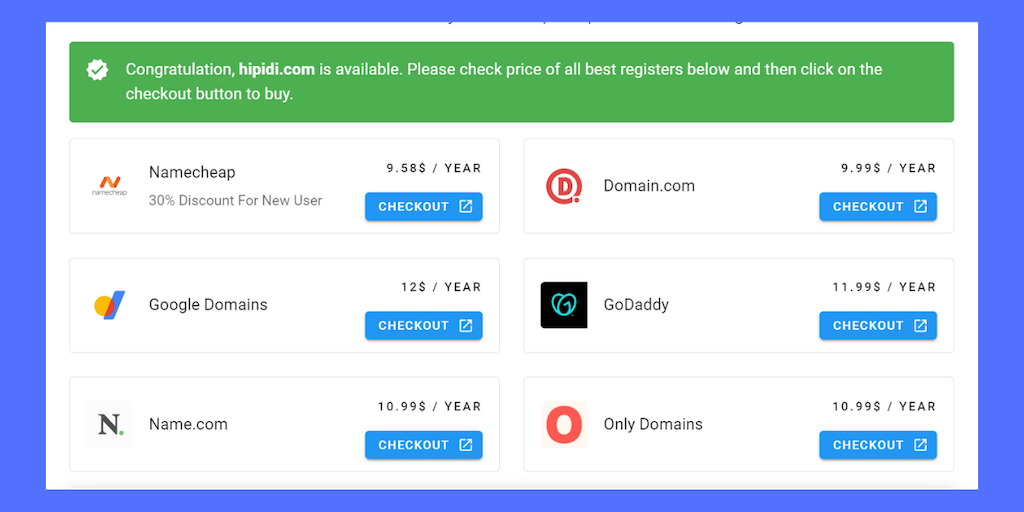 Our Domain Availability Checker tool helps you to find domains without going to any domain registrar site and the best part of this tool is it shows the prices of almost all the best domain registrars