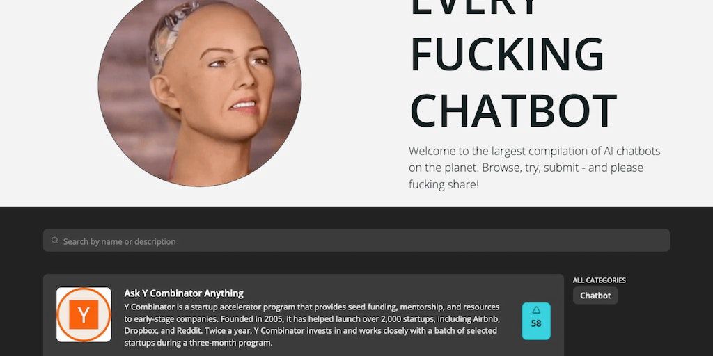 Every Fucking Chatbot is the largest directory of AI-driven chatbots with entries ranging from ‘Ask Y Combinator Anything’ to ‘Michael Jackson’. Browse, try, and submit!