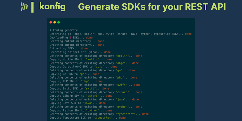 Konfig is a zero-effort way to generate high quality SDKs in all major languages for your APIs. If you have an Open API spec or Postman collection, we can do the rest from generating SDKs to testing a