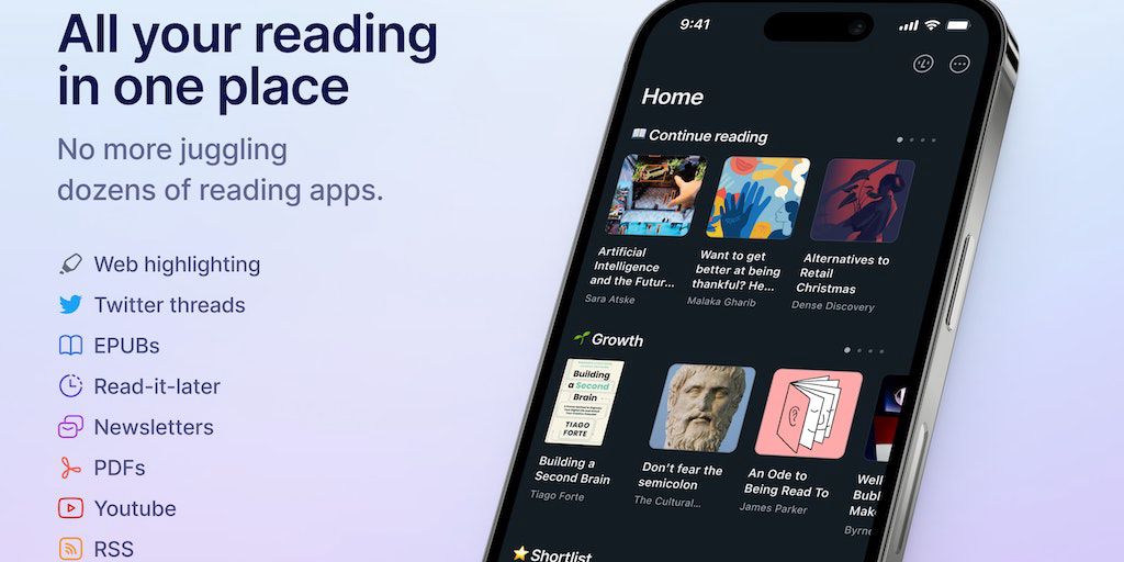 Reader lets you save all of your content to one place: From articles to Twitter threads to PDFs to newsletters to RSS to epubs to... even YouTube! You can then read, search, organize and (of course) h