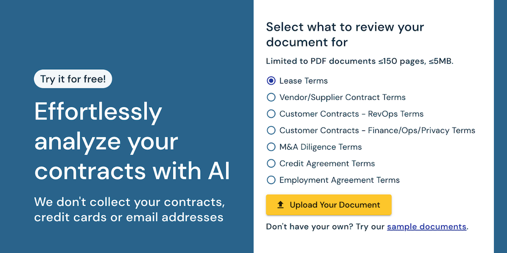 Try contracts AI for free! Upload a document (or use our sample docs) for Zuva’s AI to extract across a subset of Zuva’s 1300+ AI fields. View the extractions within the tool and see them highlighted