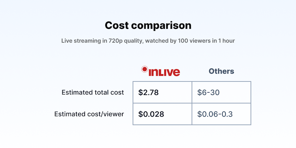 Save up to 54% of your live-streaming cost by using inLive, a WebRTC to Dash/HLS live-streaming service. Self-serve yourself by checking our website, and start building your live streaming app now wit