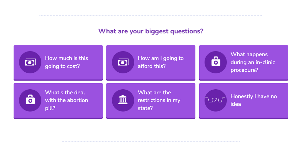 We give people seeking abortions information that's relevant to their needs. We make it easy for people to find the information and resources that apply to them, without noise or, misinformation, or s