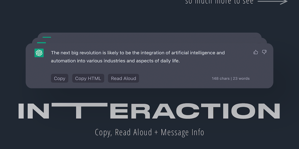 Boost your AI workflow with this extension. 🚀 After installing this extension you'll experience a much nicer ChatGPT version: Copy/Read messages, download chats, upload documents, prompt assistance, t