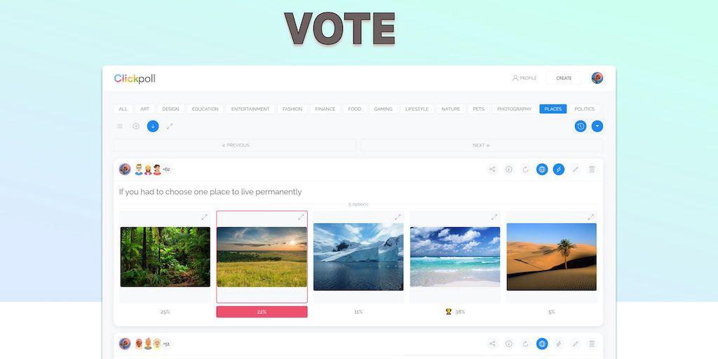 A place to vote, create and share multimedia polls for free. Discover interesting polls to vote and engage with. Create polls using images, text, audio, video, emoji, giphy, colors and url embeds. Sha