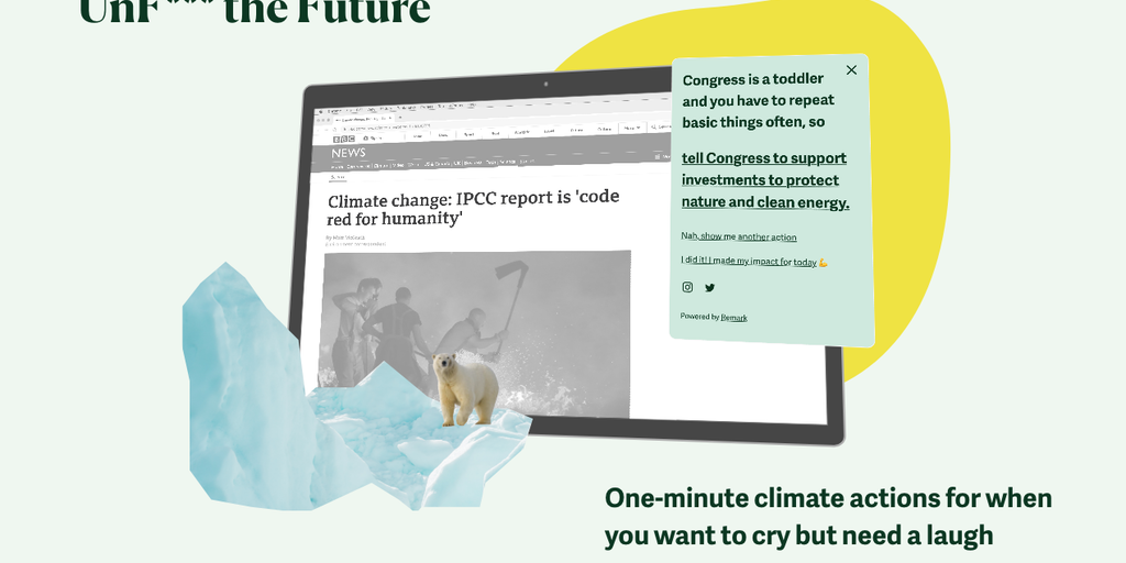 UnFuck the Future is a browser extension that provides users with snarky, one-minute climate actions whenever they are reading depressing news. Why the profanity? The climate crisis is a fucking emerg