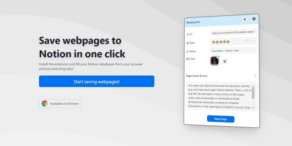 Klippper is a chrome extension allowing you to save web pages in your Notion databases without switching tabs. In addition to the page title and URL, you can start saving notes about the page directly