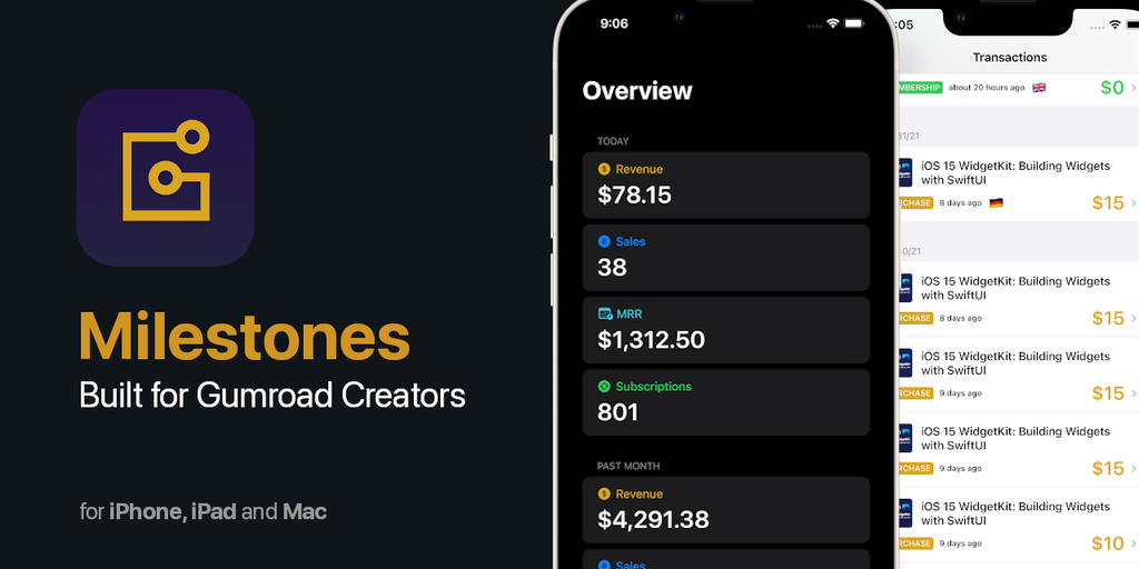 Milestones is the perfect companion for all Gumroad sellers and creators to view their real-time sales, transaction and product data! And with Push Notifications enabled, you’ll never miss the buzz of being notified of a new sale!