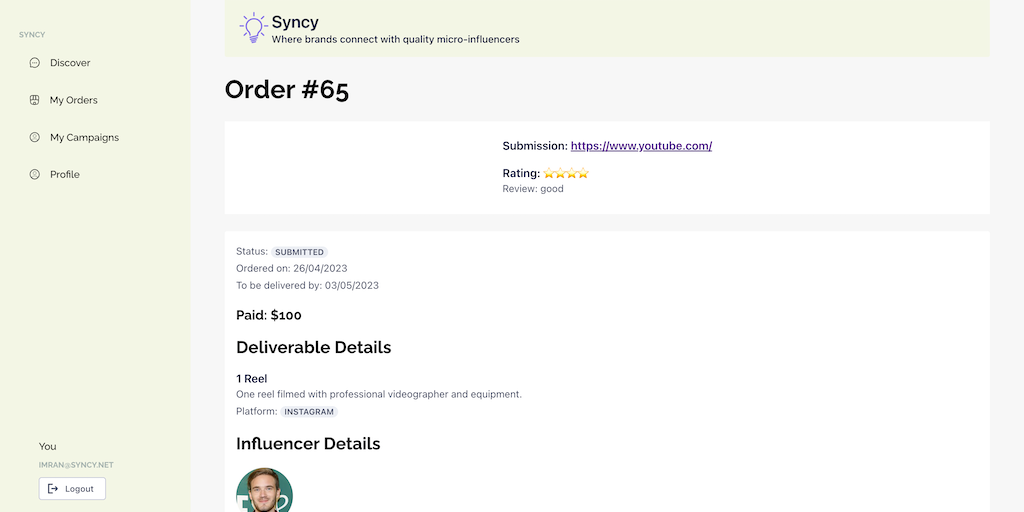 Syncy is a marketplace where brands can order User Generated Content(UGC) from social media creators instantly. Syncy has streamlined the process of finding creators, booking content deliverables, get