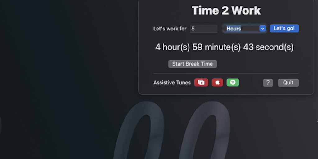 Time2Work is a productivity application that allows you to set a time that you would like to work for, so you can track how much work you've done, and how much you need to do!