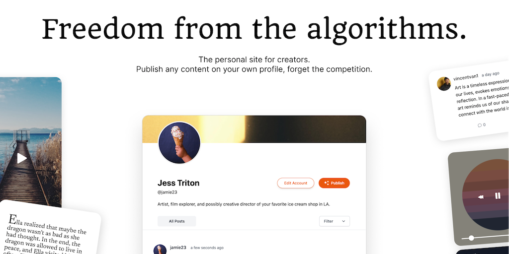 Publish your story in your space. A self-labeled profile for independent publishing with support for any content type. Freedom from the algorithms. Publish anything on your own profile, forget the com