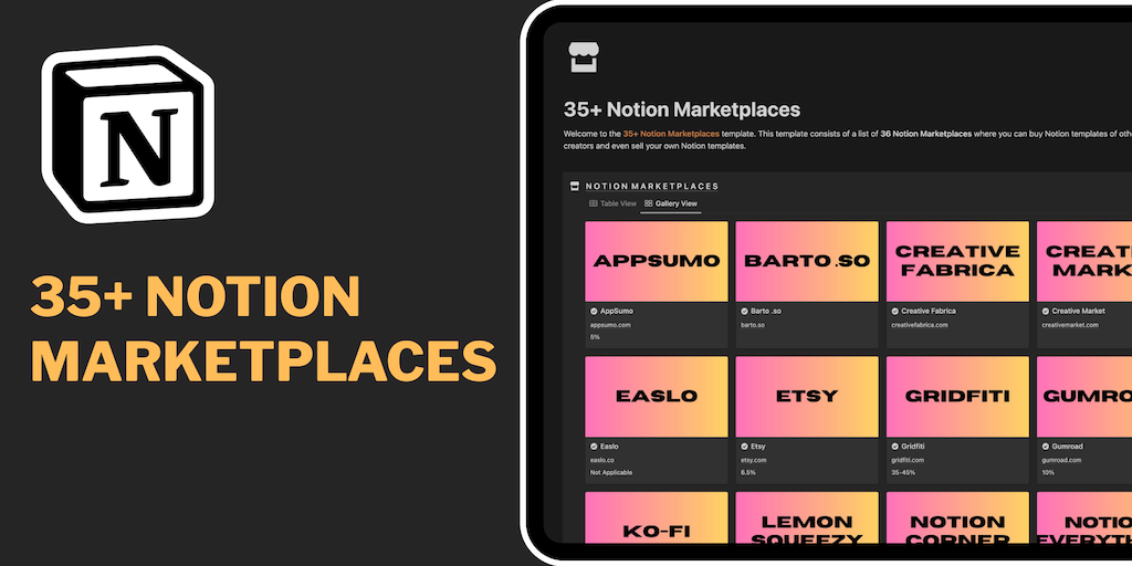 This Template consists of a list of 35+ Notion Marketplaces where you can buy Notion templates of other Notion creators and even sell your own Notion templates. You can also find the Links and Fee/Aff