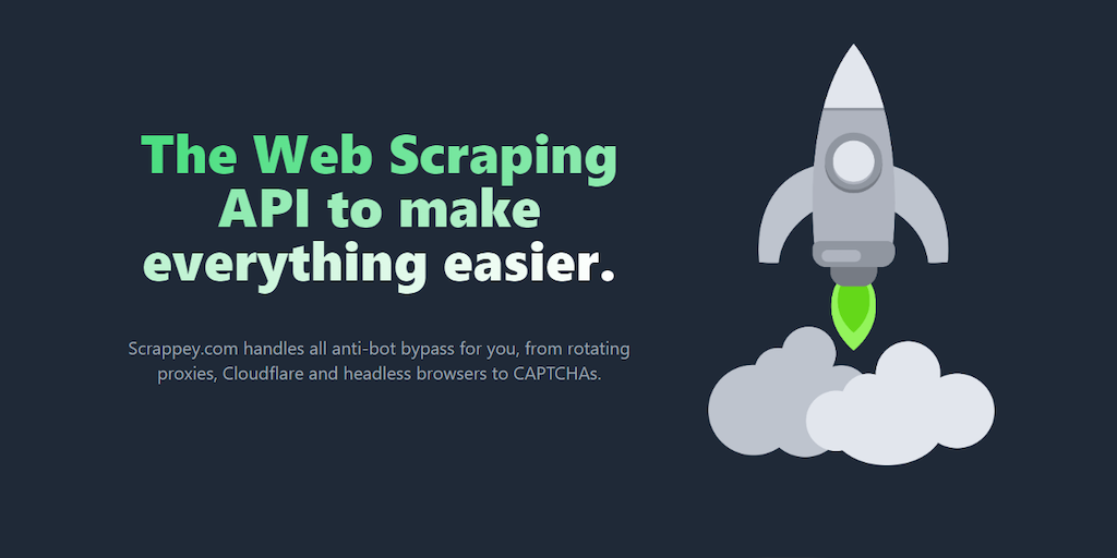 The Web Scraping API to make everything easier. Scrappey.com handles all anti-bot bypass for you, from rotating proxies, Cloudflare and headless browsers to CAPTCHAs.