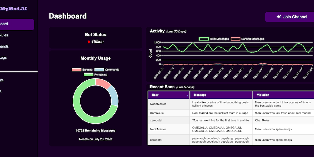 MyMod.AI is a twitch chat bot that uses Artificial Intelligence to moderate your chat. It allows you to timeout users using natural language commands and create custom AI commands to make your chat mo