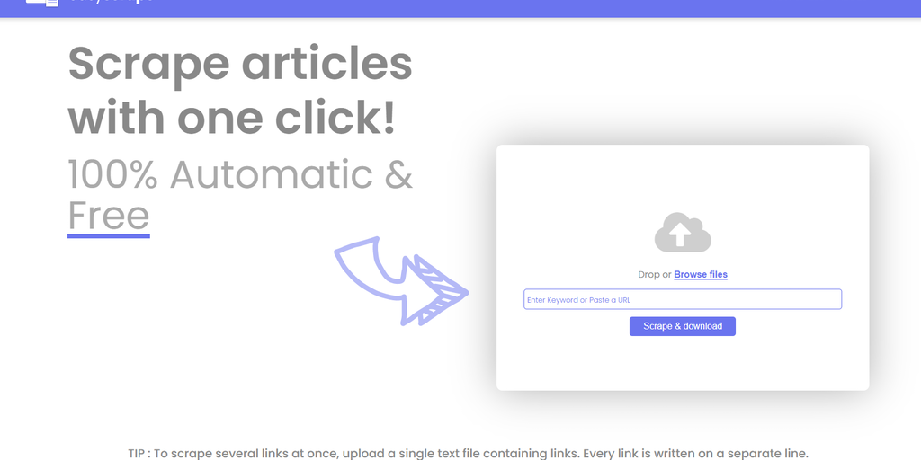 With EasyScrape you can scrape the articles from any webpage with just one click. You can upload a text file containing a list of URLs or a single URL or a keyword, articles will be scraped from those