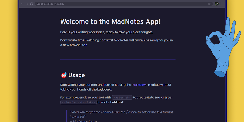 MadNotes is a super fast minimalistic notepad with live markdown rendering and a beautiful dark-first design. You don't have to open a special app to use it, it's ready for you in each new browser's t