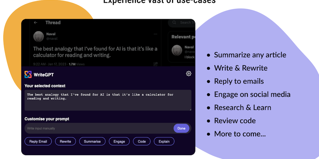 writeGPT is designed to overcome unproductive browsing habits by plugging ChatGPT capabilities on any website & search engine while facilitating effective prompt engineering to read, write, rewrite, r