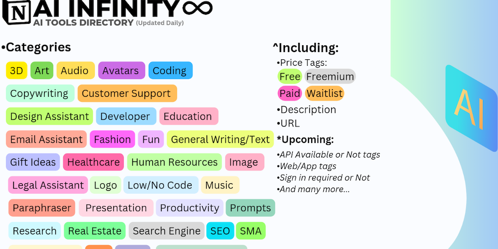 Discover the ultimate directory of AI tools! Our Notion database features over 1100+ AI tools with key information including category, pricing, URLs, and descriptions. Save time researching and find t