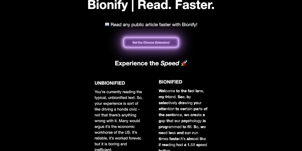 Bionify converts any public website into Bionified format, which changes texts so that the most concise parts of words are highlighted. This leads the eye over the text and helps increase reading spee