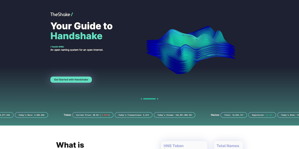 The Shake is a media and data website for the Handshake naming protocol. Learn about Handshake domains, explore apps, and track growth of the network.