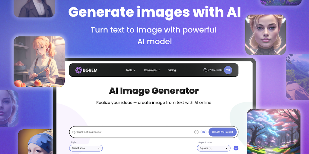 Create unique images and art from a text, generate your dream interior design, convert picture into an artwork, remove unwanted objects, text or people from your photos, remove or replace background f