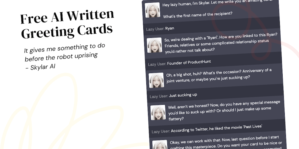 Be lazy no more with Lazy Cards! With the help of snarky AI assistant Skylar, you can easily craft bespoke, charming, or cheeky greeting cards. Tell us about your recipient and Skylar will do the rest