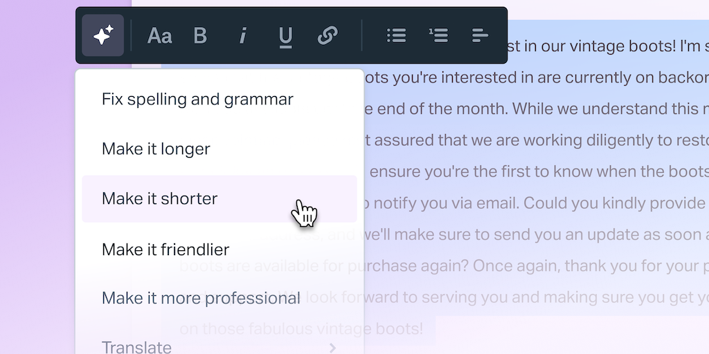 Introducing the newest AI feature in Help Scout: AI assist. With AI assist, you can make text longer or shorter, change the tone, fix grammar and spelling errors, and translate into over a dozen langu