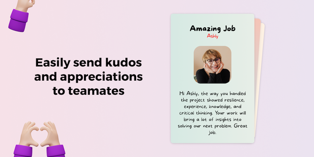 Easily send kudos and recognise teammates with Appreci bot, all within Slack. Kudos improve performance, happiness, and retention by creating a positive work culture. It's quick and easy to show your