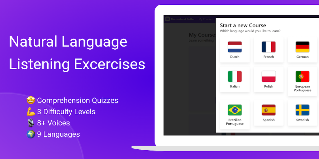 Natural Language Listening Exercises that help you jump into Conversations with native Speakers. 🌟 Natural Language Exercises 🤩 Comprehension Quizzes 💪 3 Difficulty Levels 🎙️ 8+ Voices 🌍 9 Languages