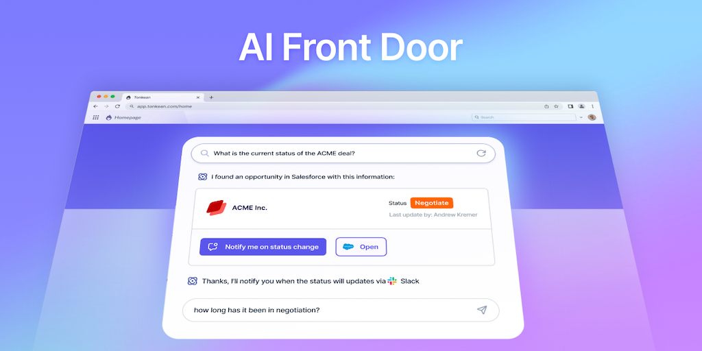 An intelligent and proactive AI-powered entry point for internal processes. Tonkean’s AI Front Door combines GPT with Tonkean’s powerful process automation to provide an exceptional experience: from i