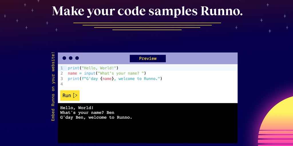 Runno - Make embeddable code snippets that run in the browser | Product Hunt
