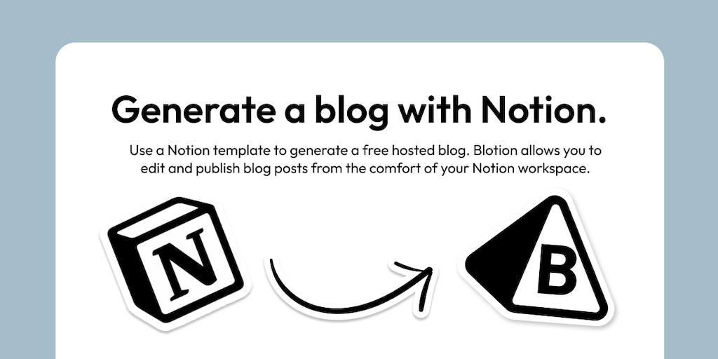 Use a Notion template to generate a free hosted blog. Blotion allows you to edit and publish blog posts from the comfort of your Notion workspace.