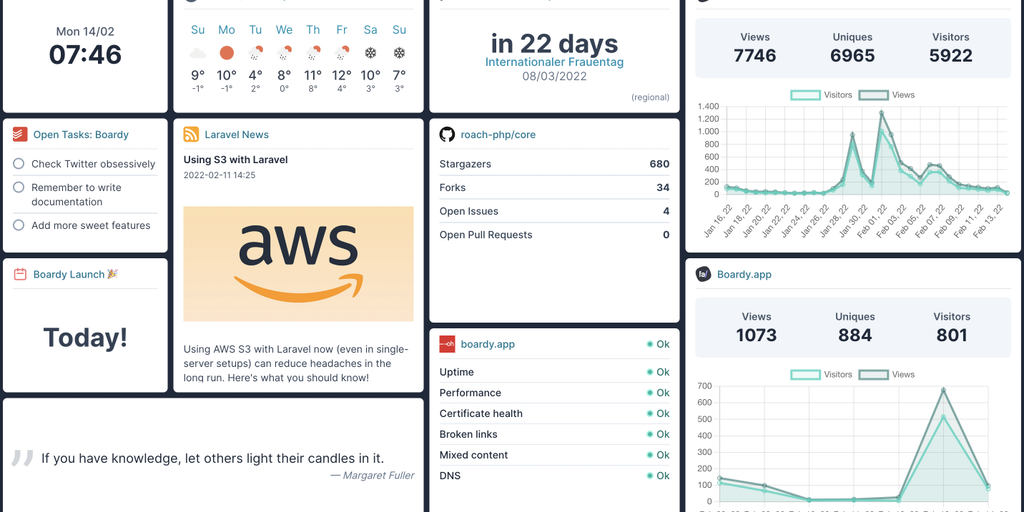Boardy lets everyone create beautiful, auto-updating dashboards without writing a single line of code. Pick from our first-party modules, or push whatever content you want to a module by using our API
