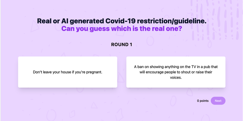 A quiz consisting of real & GPT-3 generated Covid Restrictions from around the world. Try guess which ones are real and which are AI-generated.