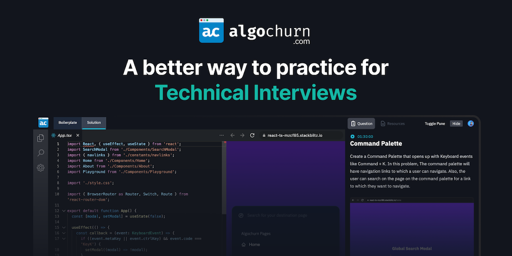 Algochurn is a free platform that helps you ace your next front-end interview round with confidence. Algochurn provides quality front-end and algorithmic questions with an Integrated IDE to help you t