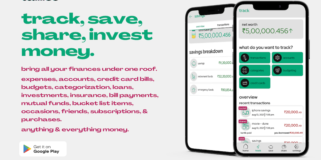Bring all your finances under one roof. Expenses, accounts, credit card bills, budgets, categorization, loans, investments, insurance, bill payments, mutual funds, bucket list items, occasions, friend