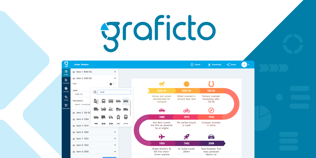 Graficto is an easy to use infographic and smart visuals maker that allows you to create visuals without any design skills. Your visuals dynamically change as you edit items or change text and icons. Just focus on the content, Graficto will do the design.
