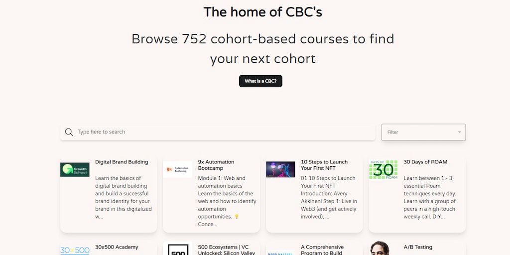 Popular brands like Maven, On Deck and Reforge produce cohort based courses, and there are hundreds more brands and individuals withy great courses around the world. We've aggregated them all (more th